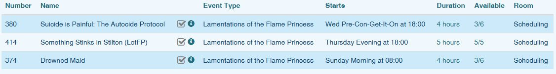 I will personally be running Suicide is Painful… and Drowned Maid. Advance spots were filled immediately, and now the last three slots have been opened up today, so grab them quick. (Something Stinks in Stilton is being run by someone else not in cahoots with me, certainly join that game, always good to see other people running LotFP!)